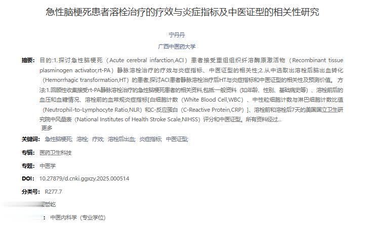 参考资料[1]宁丹丹.急性脑梗死患者溶栓治疗的疗效与炎症指标及中医证型的相关性研究[D].广西中医药大学,2025.